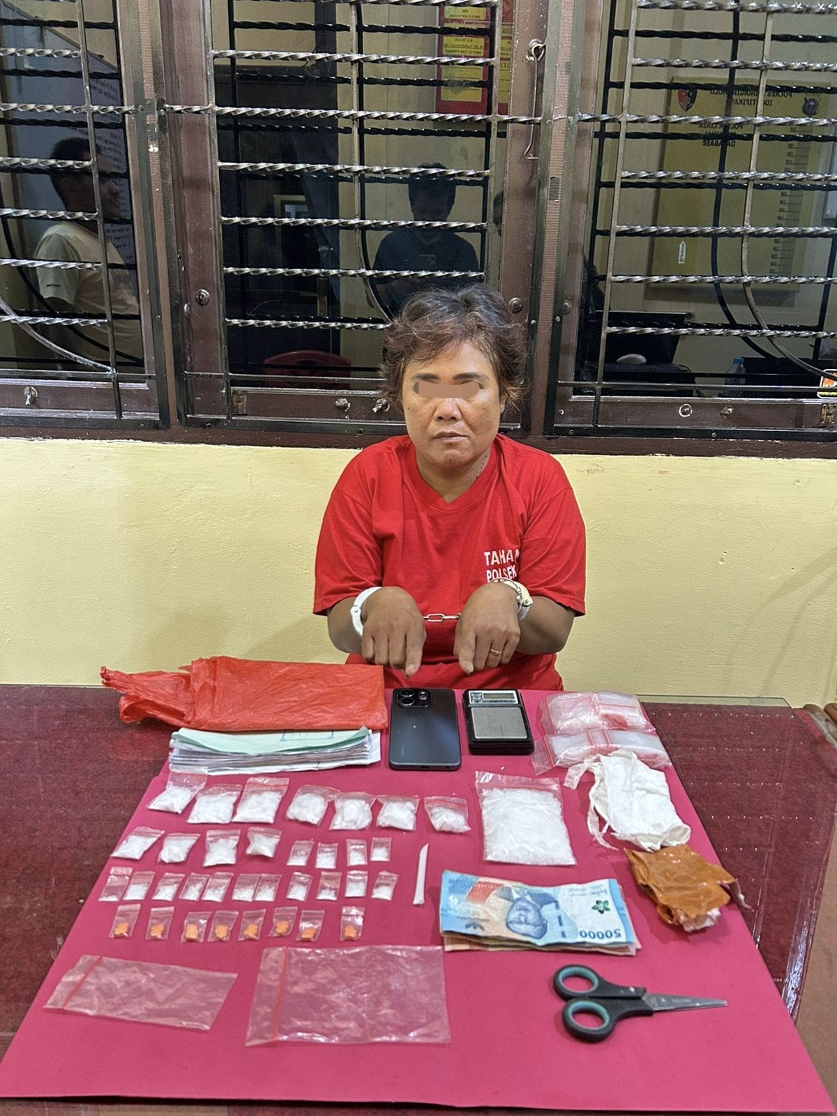 Selain itu, turut diamankan sejumlah barang bukti lain berupa timbangan digital , plastik klip kosong berbagai ukuran, gunting, pipet sendok, buku catatan merek Okey warna hijau, satu unit handphone Android merek Infinix Smart 9 warna hitam, serta uang tunai Rp500.000 yang diduga hasil transaksi.