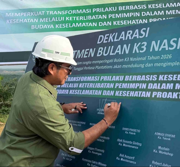 Indragiri Hulu|KX – Komitmen terhadap keselamatan dan kesehatan kerja terus diperkuat perusahaan perkebunan kelapa sawit PT Tunggal Perkasa Plantations (PT TPP), melalui penyelenggaraan Apel Bulan Keselamatan dan Kesehatan Kerja (K3) Nasional Tahun 2026. Kegiatan yang digelar pada Senin (16/2), di area operasional perusahaan ini diikuti jajaran manajemen, staf, serta pekerja sebagai wujud konsolidasi budaya keselamatan di lingkungan kerja.