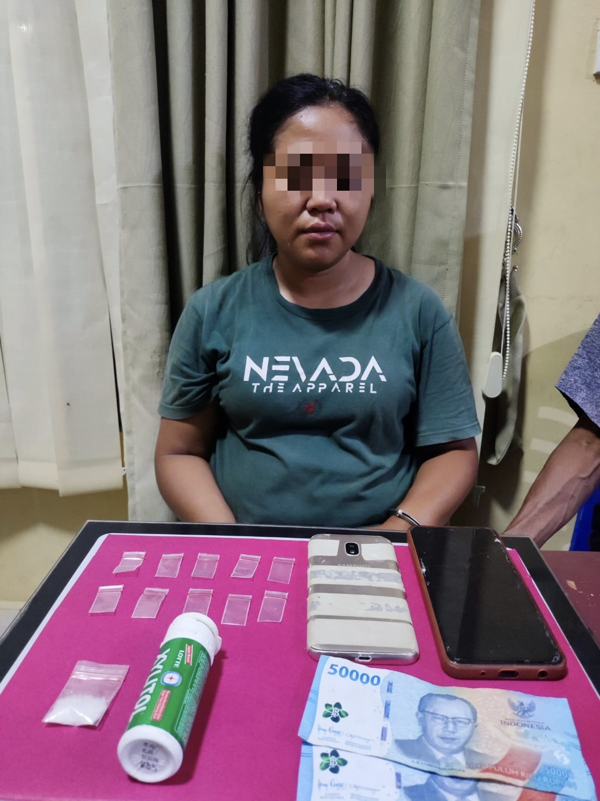 Petugas kemudian melakukan penggeledahan di sekitar lokasi. Hasilnya, ditemukan sebuah kotak permen merek Xylitol berwarna hijau yang berisi satu bungkus plastik klip bening diduga sabu serta 10 plastik klip kosong. Selain itu, dari tangan tersangka juga diamankan dua unit handphone masing-masing merek Samsung Galaxy J7 Pro dan Vivo Y18, serta uang tunai sebesar Rp100.000.