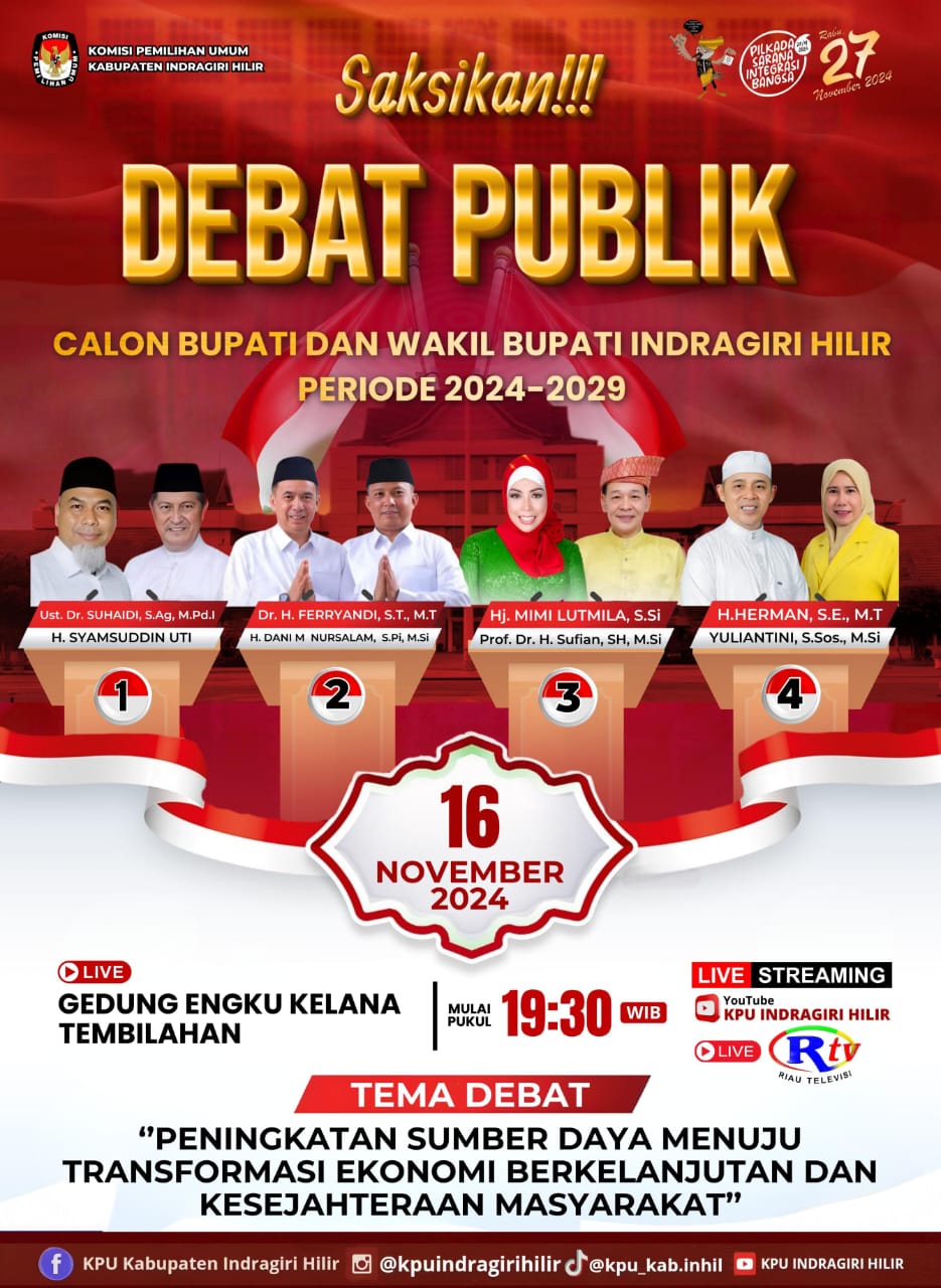 Komisi pemilihan umum (KPU) kabupaten Indragiri hilir akan melaksanakan debat pasangan calon Bupati dan wakil bupati pada tanggal 16 Nopember 2014 mendatang.