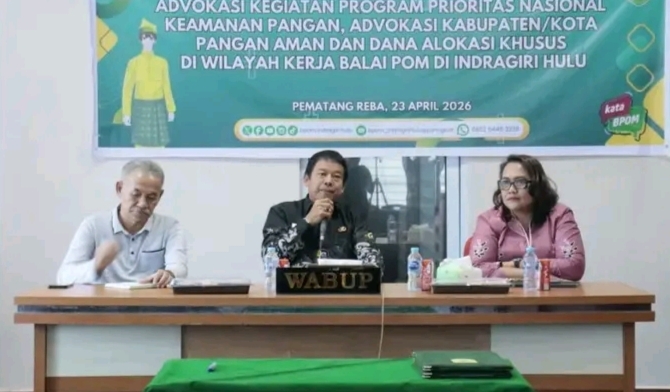 Inhu|KX – Komitmen menjaga keamanan pangan di Kabupaten Indragiri Hulu terus diperkuat. Wakil Bupati Inhu, Ir. Hendrizal, M.Si., secara resmi membuka Advokasi Program Prioritas Nasional Keamanan Pangan, Kabupaten/Kota Pangan Aman serta Dana Alokasi Khusus di Ruang Narasinga Lantai II Kantor Bupati Inhu, Kamis, 23 April 2026.